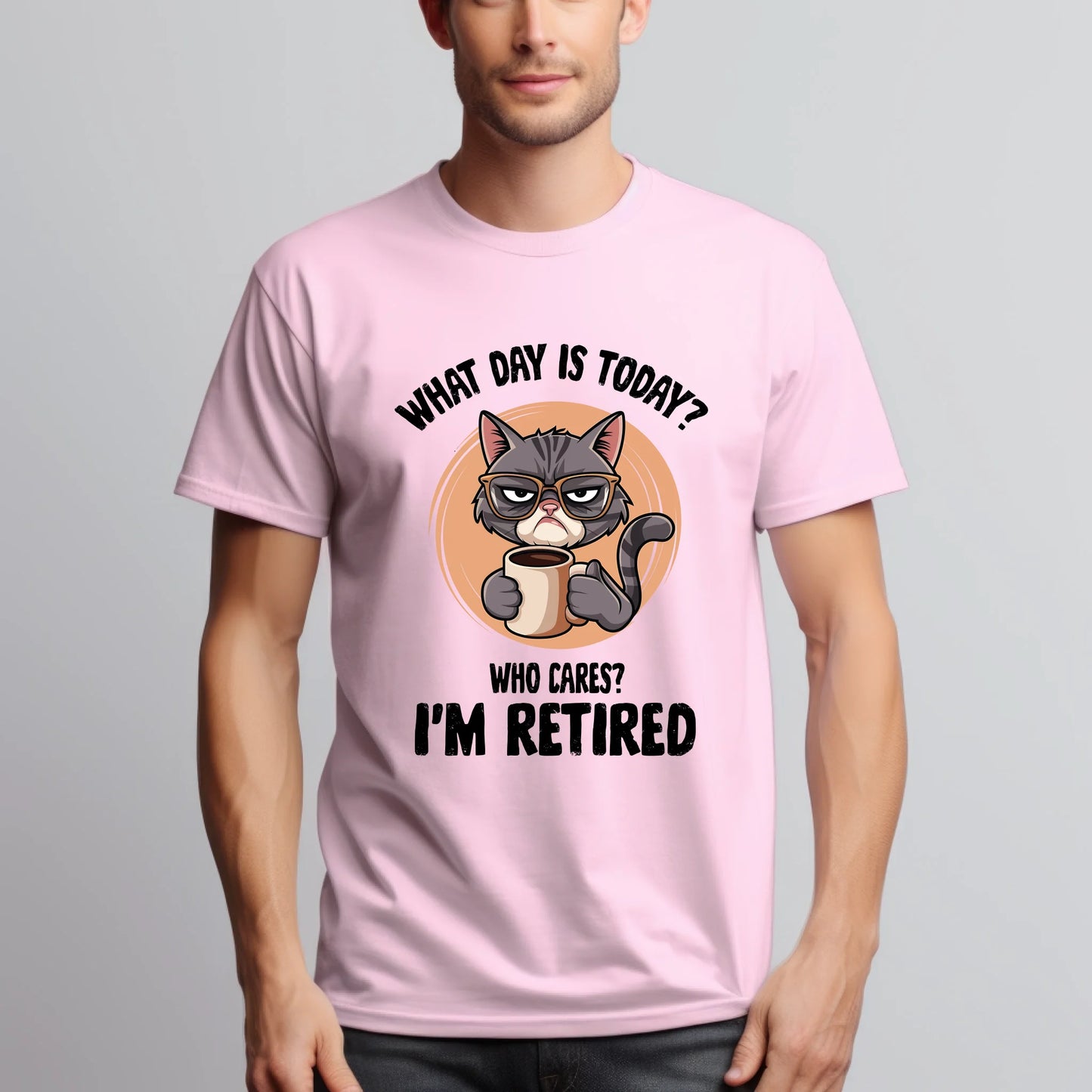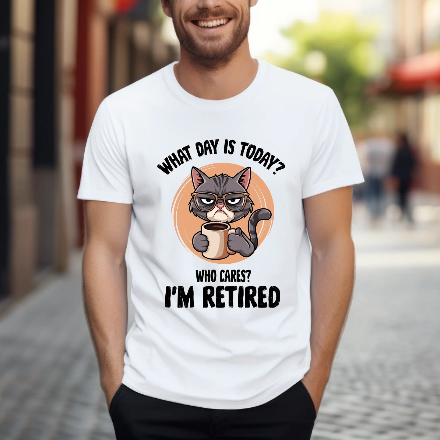 What Day Is Today? I’m Retired Cat T-Shirt – Funny Retirement Gift Tee for Men & Women